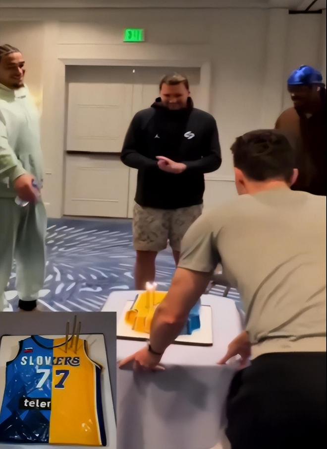 球隊也在東契奇真正生日當天為他慶祝,定制了一面是湖人球衣、一面是斯洛文尼亞國家隊球衣的蛋糕。被問及生日當天的情況時,東契奇還調侃說隊友沒有送自己任何生日禮物,太離譜了。