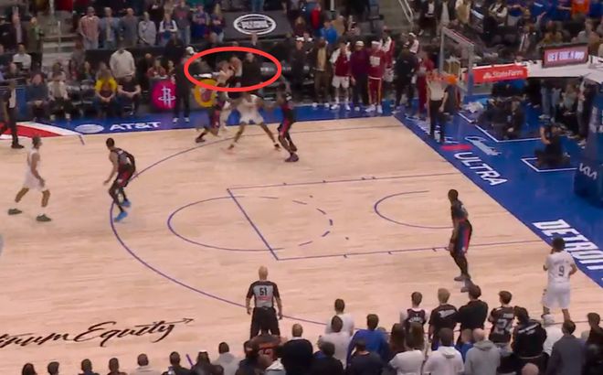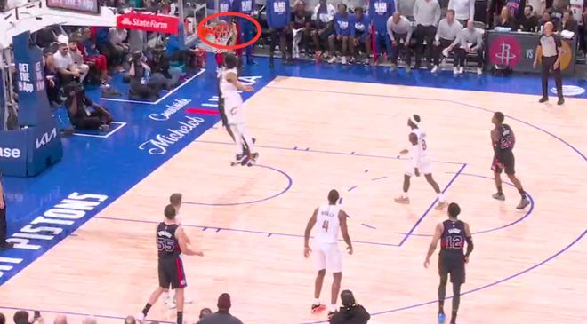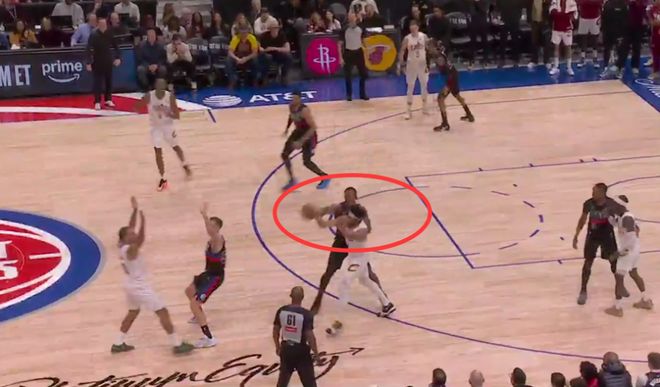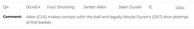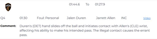 第一次是漏判,發生在距離第四節結束還有1分30秒。杜倫的手從球上滑開,主動接觸到了艾倫的手腕,影響了他完成預期傳球的能力。這次非法接觸導致了艾倫的傳球失誤。這本該吹杜倫防守犯規,但裁判沒有響哨,這是一次漏吹的防守犯規,并導致騎士失誤,對手搶斷得分。活塞獲利,騎士吃虧。