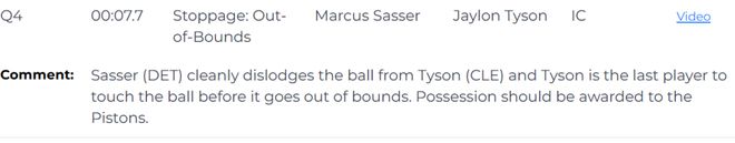 第三次也是錯判,發生在距離第四節結束還有7.7秒。活塞的薩瑟干凈地從泰森手中斷球,泰森是球出界前最后觸球的球員。球權應判給活塞隊。但裁判判給了騎士,這是一次錯誤的判罰,活塞吃虧,騎士獲利。